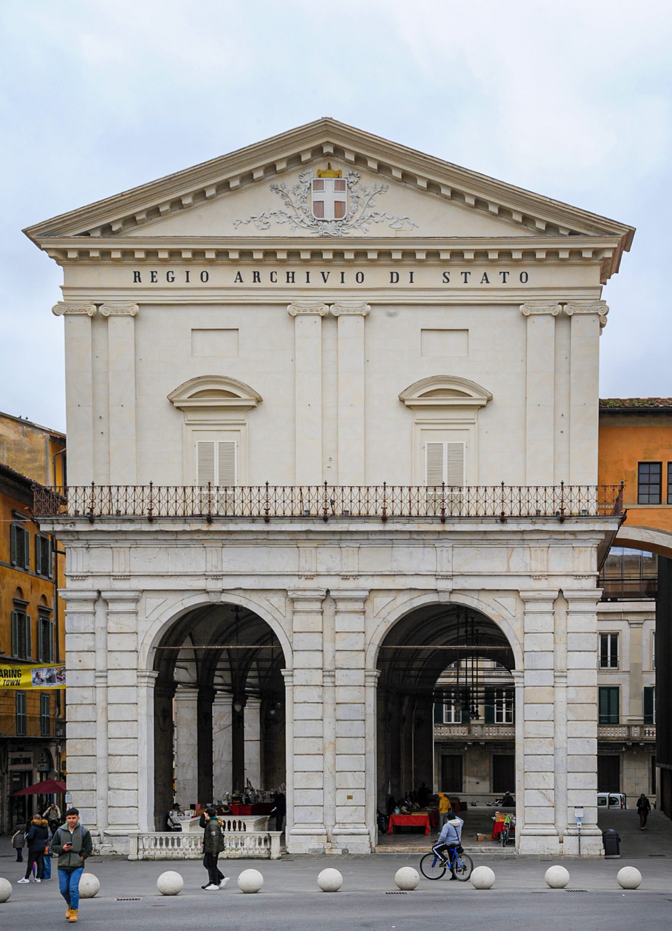 Le Logge di Banchi, furono fatte edificare dal Granduca Ferdinando I dei Medici nell’anno 1606, L’edificio , progettato dal grande architetto fiorentino Bernardo Buontalenti e costruito da Cosimo Pugliani, è costituito in basso da un loggiato formato da dodici pilastri dorici rivestiti in marmo con lo spazio diviso in otto campate, al di sopra dei quali si trova la parte superiore chiusa. La parte a loggiato inizialmente creata a beneficio dei mercanti di lana e di seta, una volta decadute queste attività, fi a mercato dei cereali, che vi si teneva due volte alla settimana, mentre il piano superiore fu sede dell’Ufficio dei Fossi, una delle più importanti magistrature cittadine che vi conservava anche il proprio archivio. La parte superiore dell’edificio venne dotata nel Settecento di un frontone barocco a volute, forse opera del veronese Ignazio Pellegrini, architetto granducale. Seguirono altri mutamenti dopo la Restaurazione lorenese a partire dal 1815. venne rialzato l’intero edificio e il frontone barocco fu rimosso e sostituito da uno triangolare, con al centro lo stemma dei Lorena, cui seguì, dopo l’Unità d’Italia, lo stemma sabaudo tuttora presente. Altri lavori interessarono la parte superiore dell’edificio al momento della creazione dell’Archivio di Stato che dal 1865 subentrò all’Ufficio dei Fossi, in particolare fu ampliato lo lo spazio e fu costruito il passaggio, tuttora esistente, che collega la Loggia a Palazzo Gambacorti, sede del Comune di Pisa.
